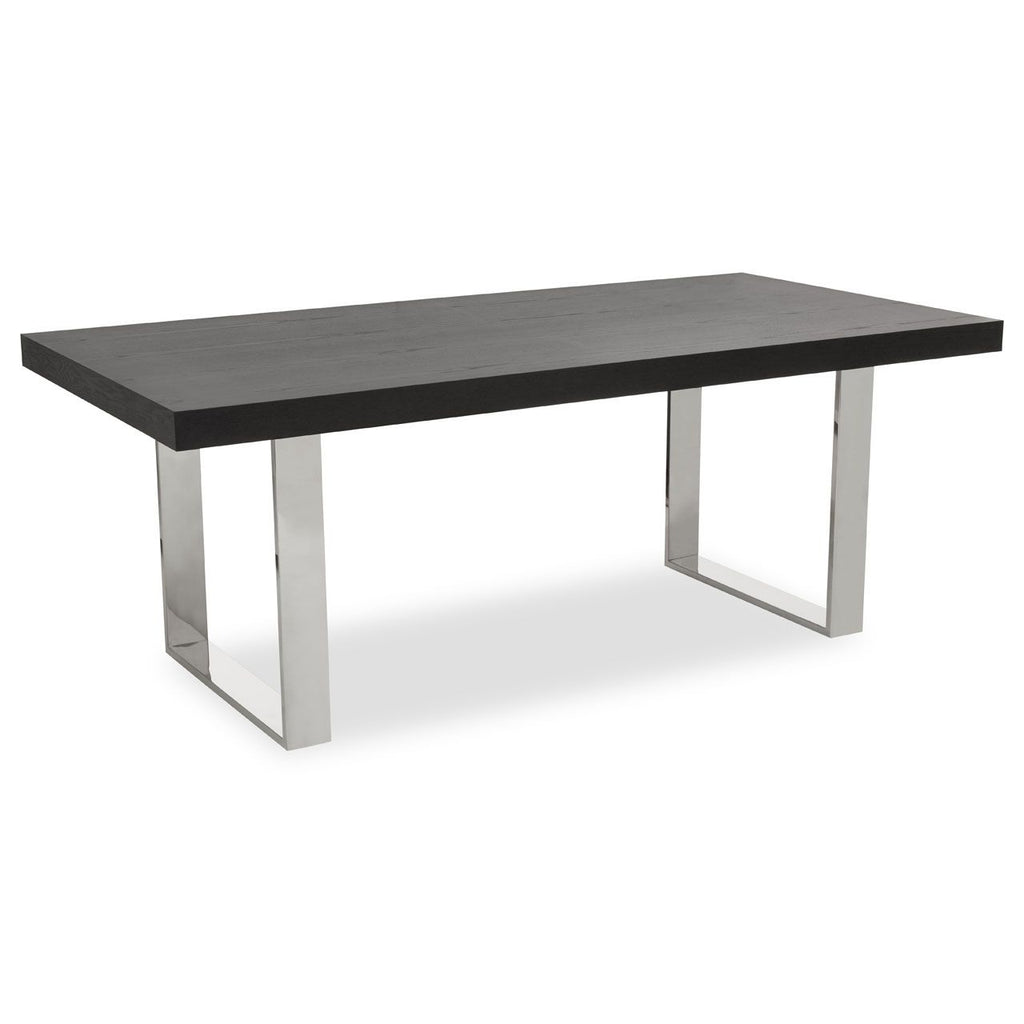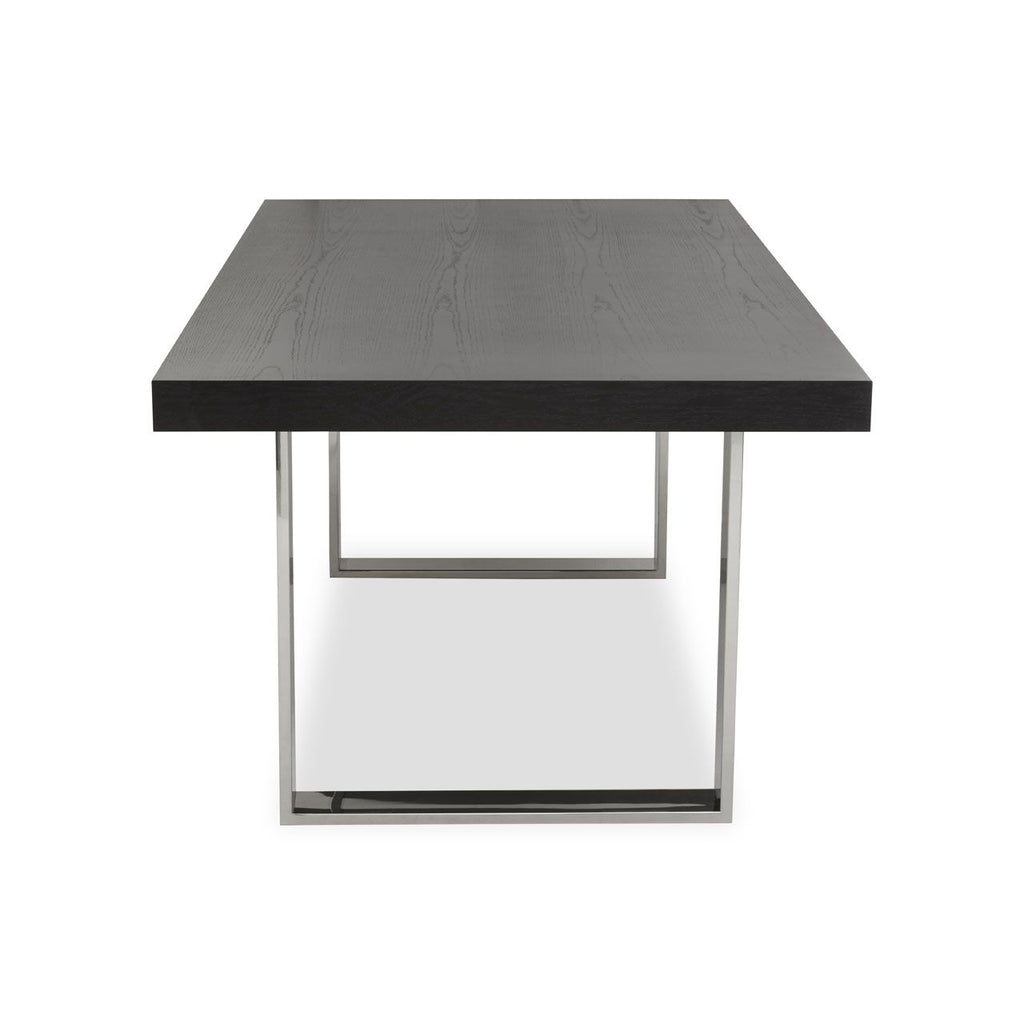 Boasting a retro design, this dining table exhibits urban and industrial appeal with its minimal yet robust construction. Supported by U-shaped stainless steel legs, the rectangular top of this dining table is made of sustainable elm wood in a black finish.